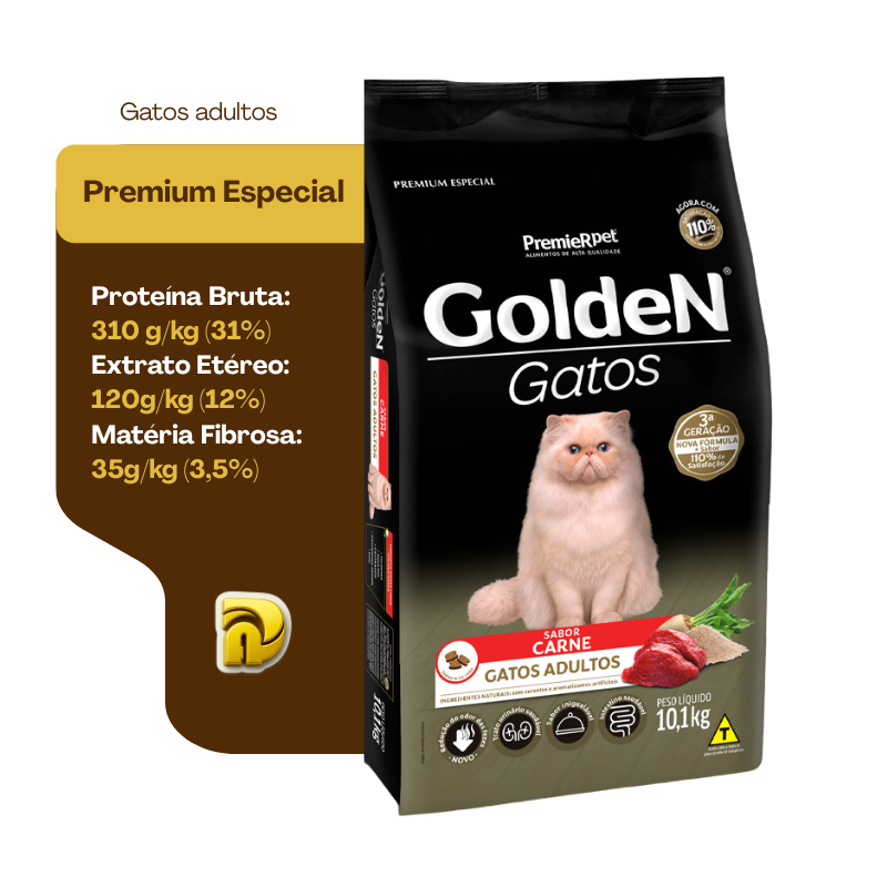 Farinha de carne, farinha de vísceras de frango, proteína isolada de suíno, farelo de glúten de milho 60*, milho integral moído*, quirera de arroz, polpa de beterraba, gordura de frango, gordura suína, óleo de peixe, aditivo acidificante, antioxidantes BHA e BHT, cloreto de potássio, cloreto de sódio, extrato de yucca (0,05%), DL-metionina, hidrolisado de frango, levedura seca de cervejaria, L-lisina, bentonita, mananoligossacarídeos (0,2%), taurina, vitamina A, vitamina B12, vitamina C, vitamina D3, vitamina E, vitamina K3, ácido fólico, ácido pantotênico, biotina, cloreto de colina, niacina, piridoxina, riboflavina, tiamina, cobre aminoácido quelato, ferro aminoácido quelato, iodeto de potássio, manganês aminoácido quelato, selênio metionina, sulfato de cobre, sulfato de ferro, sulfato de manganês, sulfato de zinco, zinco aminoácido quelato. *Contém milho e farelo de glúten de milho 60 transgênicos (espécies doadoras de gene: Bacillus thuringiensis, Agrobacterium tumefaciens, Streptomyces viridochromogenes, Zea mays).
