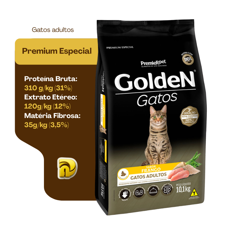 Farinha de vísceras de frango, proteína isolada de suíno, farelo de glúten de milho 60*, milho integral moído*, quirera de arroz, polpa de beterraba, gordura de frango, óleo de peixe, aditivo acidificante, antioxidantes BHA e BHT, cloreto de potássio, cloreto de sódio, extrato de yucca (0,05%), DLmetionina, hidrolisado de frango, levedura seca de cervejaria, L-lisina, bentonita, mananoligossacarídeos (0,2%), taurina, vitamina A, vitamina B12, vitamina C, vitamina D3, vitamina E, vitamina K3, ácido fólico, ácido pantotênico, biotina, cloreto de colina, niacina, piridoxina, riboflavina, tiamina, cobre aminoácido quelato, ferro aminoácido quelato, iodeto de potássio, manganês aminoácido quelato, selênio metionina, sulfato de cobre, sulfato de ferro, sulfato de manganês, sulfato de zinco, zinco aminoácido quelato. *Contém milho e farelo de glúten de milho 60 transgênicos (espécies doadoras de gene: Bacillus thuringiensis, Agrobacterium tumefaciens, Streptomyces viridochromogenes, Zea mays).