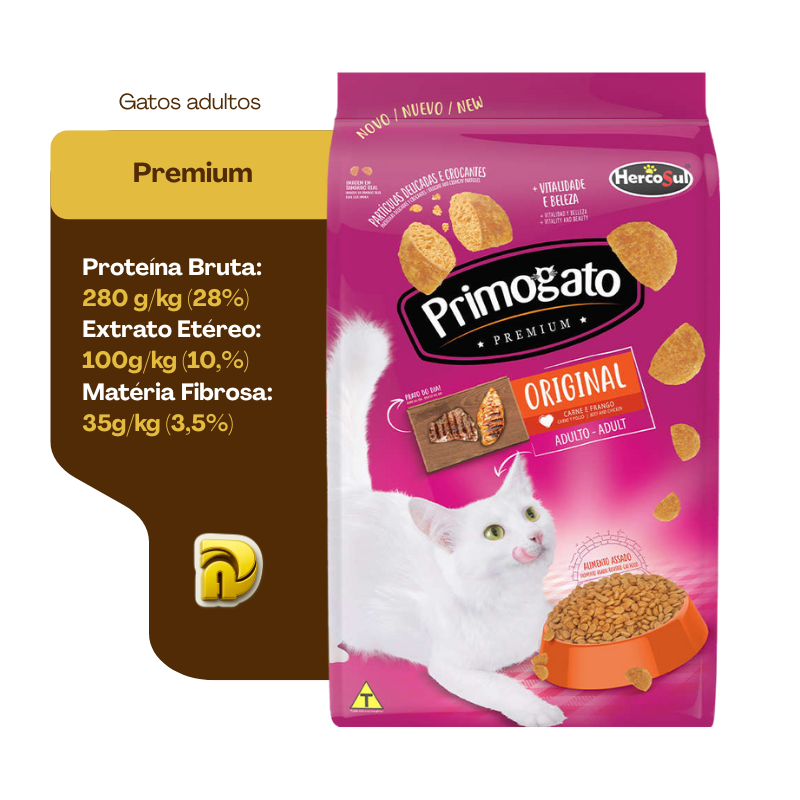 A Ração Seca Primogato Premium Original Carne e Frango para Gatos Adultos é um alimento 100% completo e balanceado que proporciona vitalidade e beleza para o seu gato adulto (não castrado).