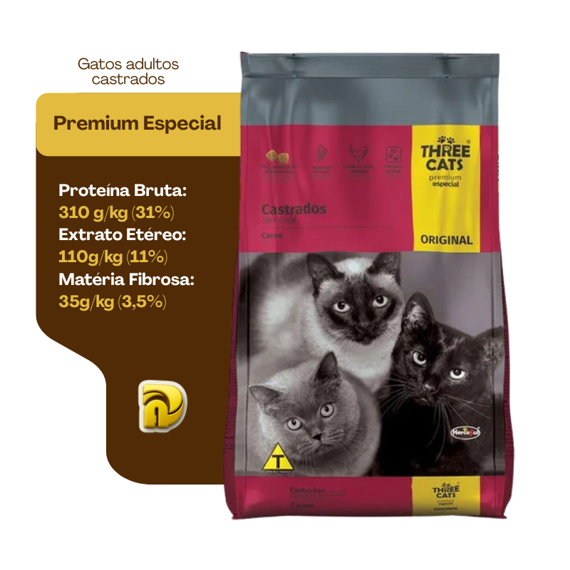 Ração Three Cats Original Gatos Castrados - Sabor Carne