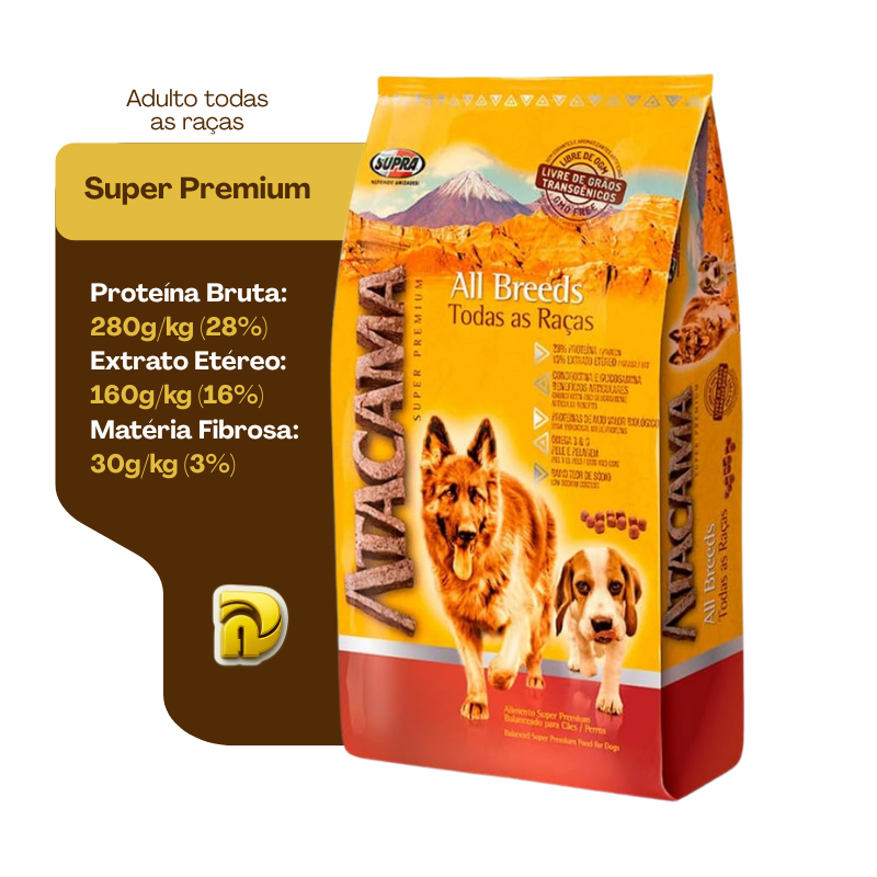 A Ração Atacama Todas as Raças para Cães Adultos é um alimento super premium, perfeito para cães de alta performance e alta exigência nutricional. Possui cinco fontes de proteína animal de grande valor biológico - Carne, Frango, Peixe, Carne Suína e Ovo Proporcionando melhor sabor ao alimento. Sua formulação supre as necessidades nutricionais dos diversos tamanhos, estágios e estilos de vida.