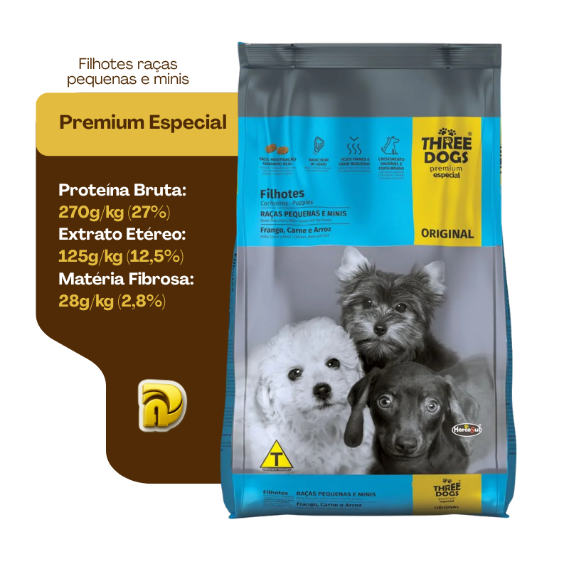 É um alimento moderno e seguro, livre de corantes e aromatizantes artificiais que apresenta ótimo custo benefício. Sua receita é rica em ingredientes de elevada qualidade que fornecem proteínas, energia, vitaminas e minerais balanceados. Three Dogs Premium Especial Original Filhotes Raças Pequenas e Minis é indicado para fêmeas a partir da sexta semana de gestação até o desmame total dos filhotes.